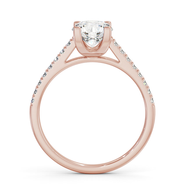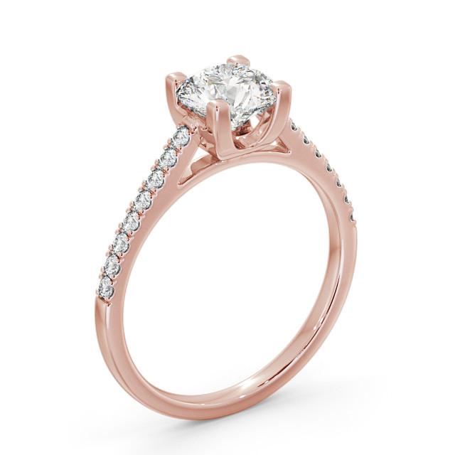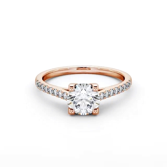 Catarina diamond engagement ring with a four claw 18K Rose Gold setting. This stunning engagement ring showcases a bold round centre diamond resting atop brightly polished diamonds lined tapered band. Total diamond side stones weigh approximately 0.15ct with Clarity VS1 and Colour F. This ring is available in a range of metal options and your choice of natural or lab grown diamonds. We offer a free design service for any customised changes that you may require.