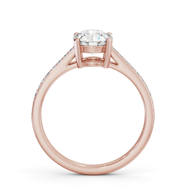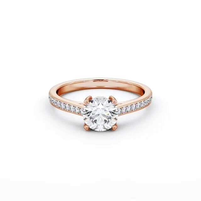Hanley diamond engagement ring with a four claw 18K Rose Gold setting. The majestic ring design features a round shaped diamond set honourably in the centre and a row of delightful small round diamonds on each side of the band. Total diamond side stones weigh approximately 0.25ct with Clarity VS1 and Colour F. This ring is available in a range of metal options and your choice of natural or lab grown diamonds. We offer a free design service for any customised changes that you may require.
