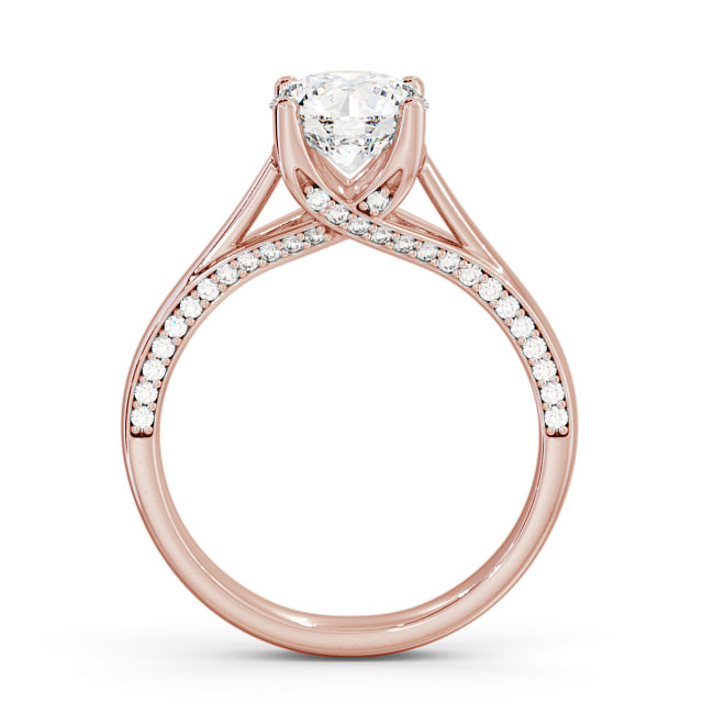 Jensen diamond engagement ring with a four claw 18K Rose Gold setting. This modern crossover design ring features a centre round diamond in a sweeping four claw setting with smaller round diamonds on shoulders sides. The diamond side stones are an approximate total of 0.30ct with Clarity VS1 and Colour F. With a mid band width of 2.2mm, this ring is available in a range of metal options and your choice of natural or lab grown diamonds. We offer a free design service for any customised changes that you may require.