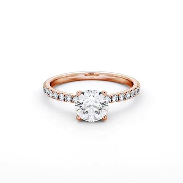 Malaya diamond engagement ring with a four claw 18K Rose Gold setting. This engagement ring flaunts a round diamond at the centre, along with small round diamonds running half way down the band and collar, resulting in an unbeatable display of brilliance. Total diamond side stones weigh approximately 0.30ct with Clarity VS1 and Colour F. This ring is available in a range of metal options and your choice of natural or lab grown diamonds. We offer a free design service for any customised changes that you may require.
