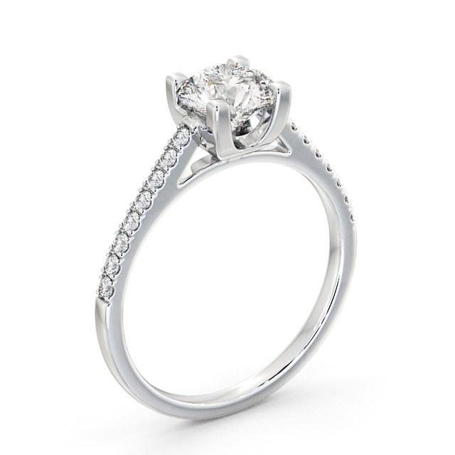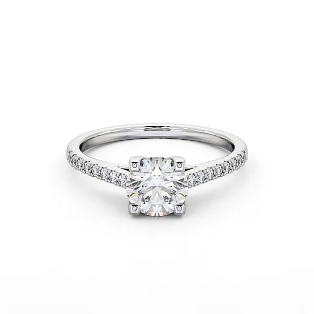 Catarina diamond engagement ring with a four claw 18K White Gold setting. This stunning engagement ring showcases a bold round centre diamond resting atop brightly polished diamonds lined tapered band. Total diamond side stones weigh approximately 0.15ct with Clarity VS1 and Colour F. This ring is available in a range of metal options and your choice of natural or lab grown diamonds. We offer a free design service for any customised changes that you may require.