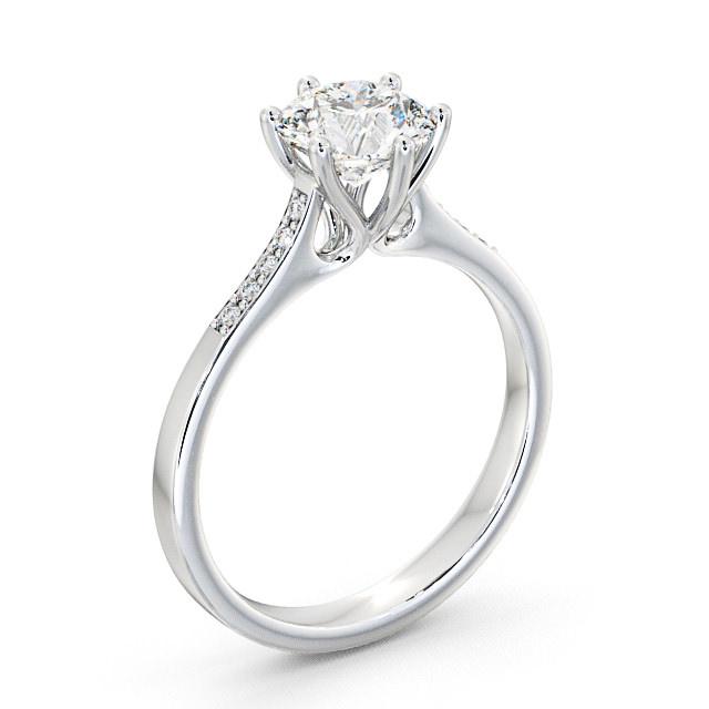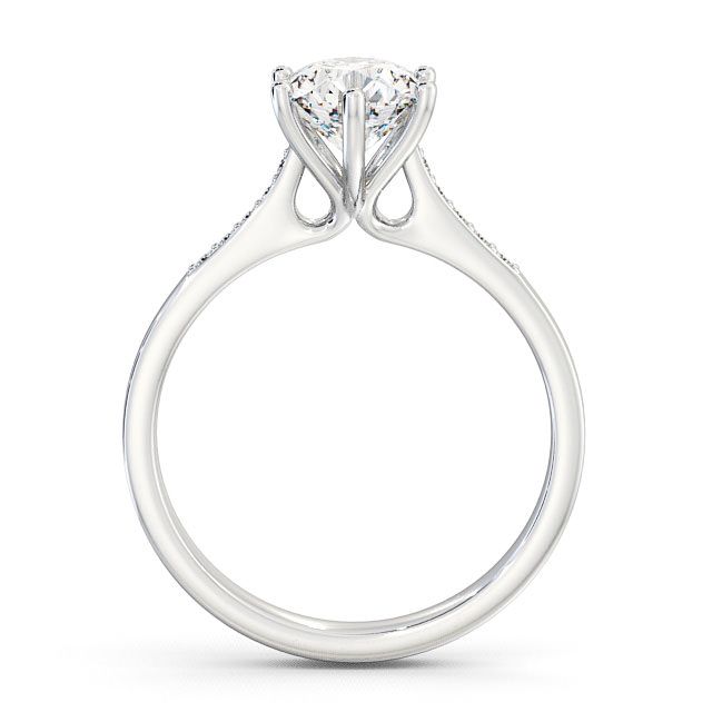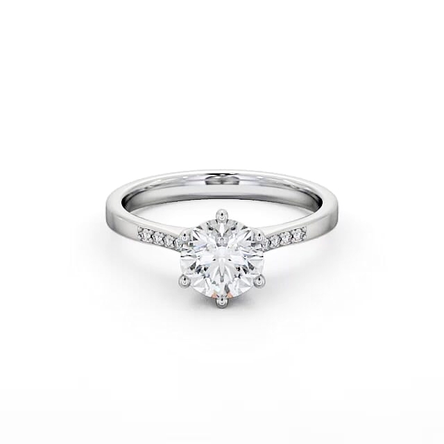 Estrelle diamond engagement ring with a six claw 18K White Gold setting. A flawless combination of classic styling with fancy allure, this engagement ring features a round centre diamond set in a charming six prong head. This tapered ring also has small diamonds on each shoulder. Total diamond side stones weigh approximately 0.05ct with Clarity VS1 and Colour F. This ring is available in a range of metal options and your choice of natural or lab grown diamonds. We offer a free design service for any customised changes that you may require.
