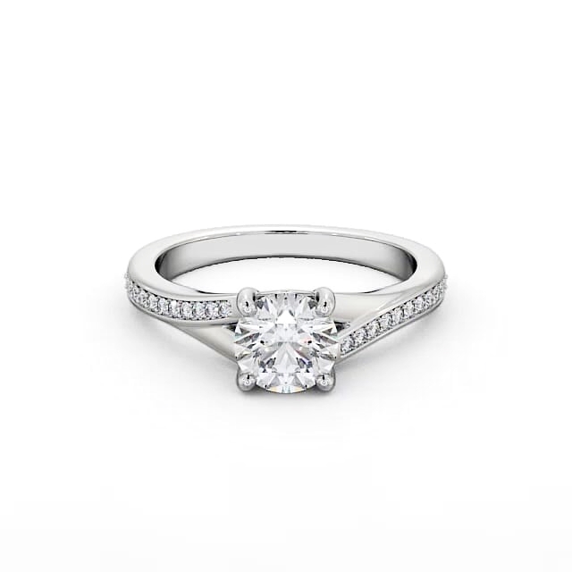Kaylen diamond engagement ring with a four claw 18K White Gold setting. This elegant engagement ring features a round diamond prong set atop a split band lined with small round diamonds. Total diamond side stones weigh approximately 0.20ct with Clarity VS1 and Colour F. This ring is available in a range of metal options and your choice of natural or lab grown diamonds. We offer a free design service for any customised changes that you may require.