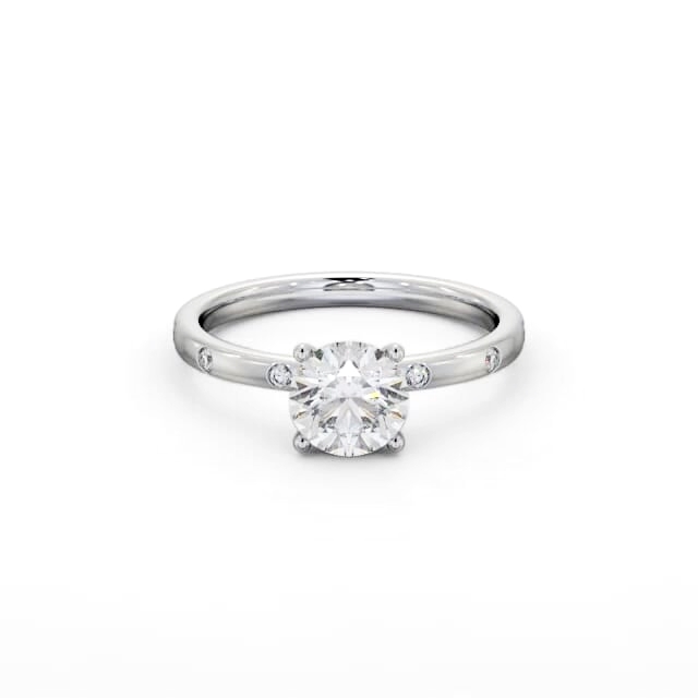 Teegan diamond engagement ring with a four claw 18K White Gold setting. This classic, modern, and sophisticated ring is adorned with a fabulous round diamond prong set in the centre and additional smaller round diamonds spaced out on a polished band. Total diamond side stones weigh approximately 0.06ct with Clarity VS1 and Colour F. This ring is available in a range of metal options and your choice of natural or lab grown diamonds. We offer a free design service for any customised changes that you may require.