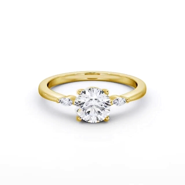 Alaya diamond engagement ring with a four claw 18K Yellow Gold setting. Stylish and sophisticated, this gorgeous ring flaunts a round shaped centre diamond along with marquise shaped side diamonds for an eye-catching allure. Total diamond side stones weigh approximately 0.04ct with Clarity VS1 and Colour F. This ring is available in a range of metal options and your choice of natural or lab grown diamonds. We offer a free design service for any customised changes that you may require.