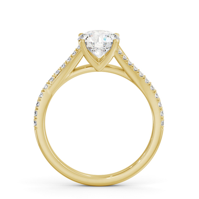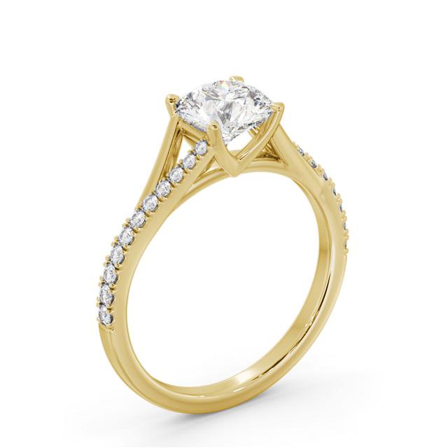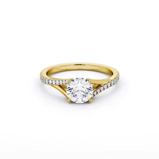 Ariya diamond engagement ring with a four claw 18K Yellow Gold setting. Warm and lively, a round shaped centre diamond stands out with its spectacular sparkle while petite round diamonds beautify the split design band. Total diamond side stones weigh approximately 0.22ct with Clarity VS1 and Colour F. This ring is available in a range of metal options and your choice of natural or lab grown diamonds. We offer a free design service for any customised changes that you may require.