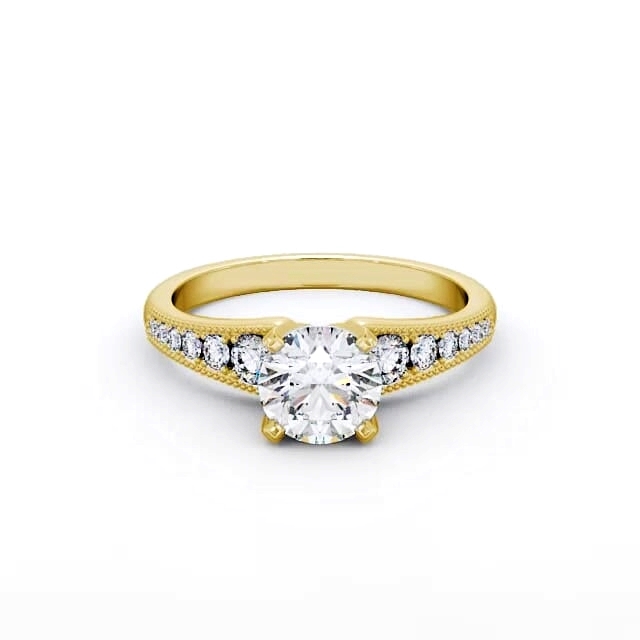 Brooklynn diamond engagement ring with a four claw 18K Yellow Gold setting. Offering immense appeal, this ring boasts a four-prong set round diamond, accented by small round diamonds cascading down both sides of the band with milgrain detailing. Total diamond side stones weigh approximately 0.28ct with Clarity VS1 and Colour F. This ring is available in a range of metal options and your choice of natural or lab grown diamonds. We offer a free design service for any customised changes that you may require.