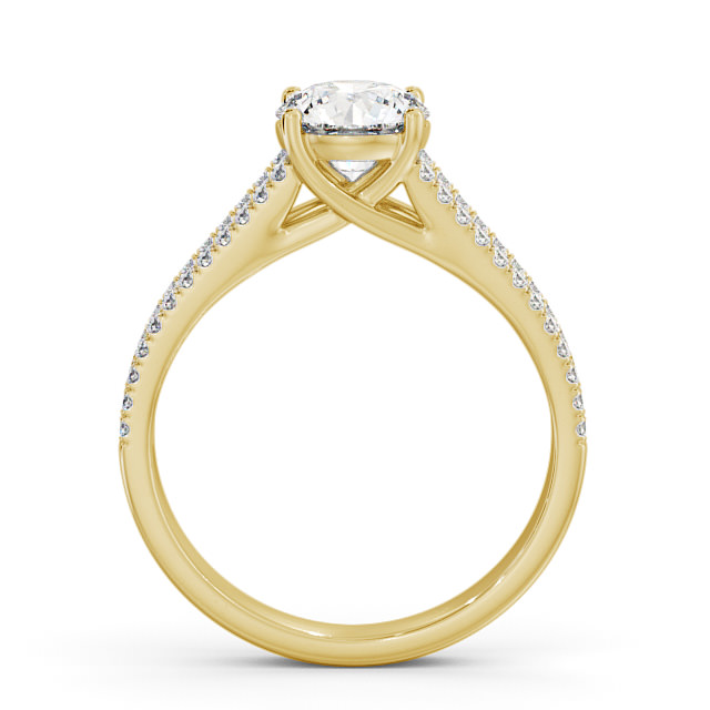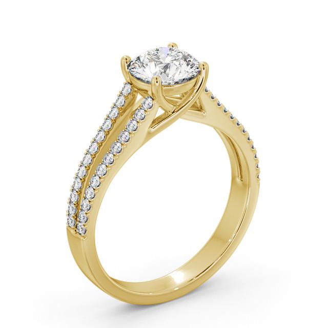 Liliana diamond engagement ring with a four claw 18K Yellow Gold setting. Elegantly extravagant, this engagement ring shimmers with a large round diamond at the centre accompanied by small round diamonds flowing down each side of the split shank. Total diamond side stones weigh approximately 0.20ct with Clarity VS1 and Colour F.