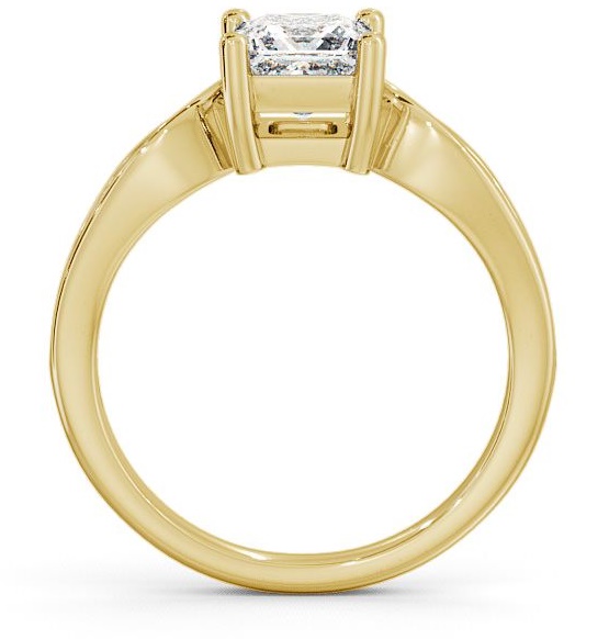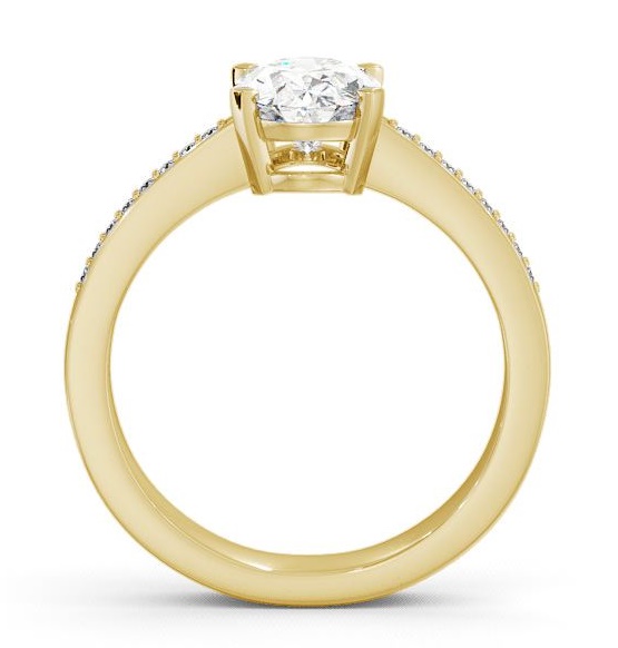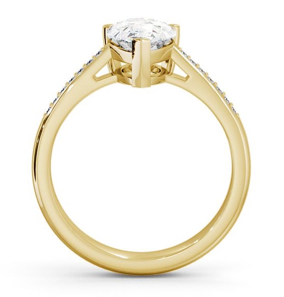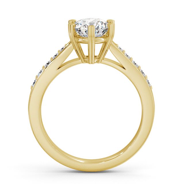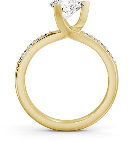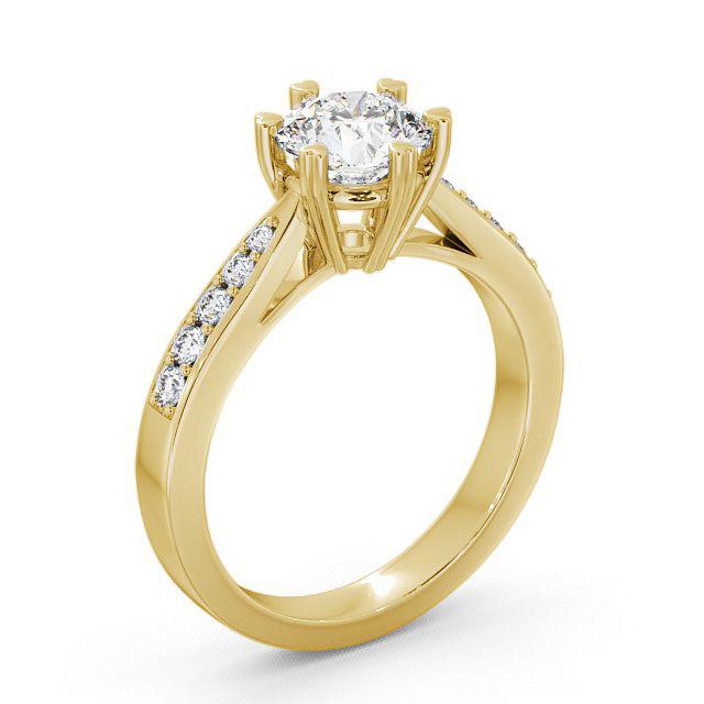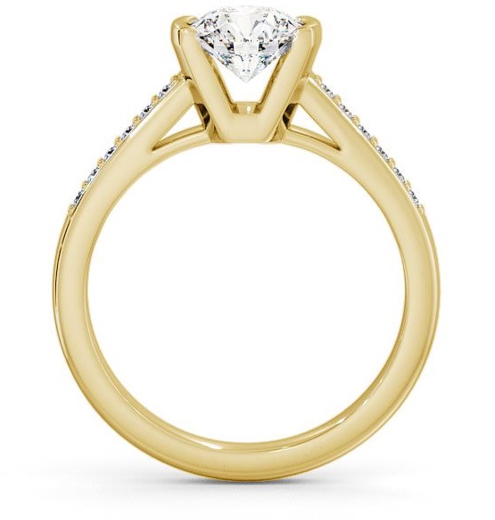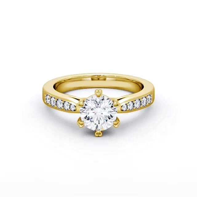 Siana diamond engagement ring with a six claw 18K Yellow Gold setting. This alluring engagement ring features a large round diamond nestled inside a six prong setting at the centre along with additional small diamonds flowing down the shank. Total diamond side stones weigh approximately 0.15ct with Clarity VS1 and Colour F. This ring is available in a range of metal options and your choice of natural or lab grown diamonds. We offer a free design service for any customised changes that you may require.