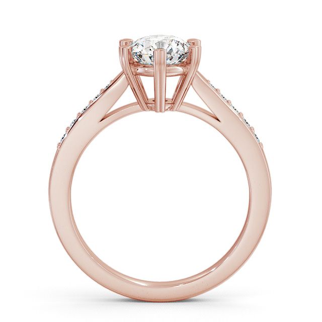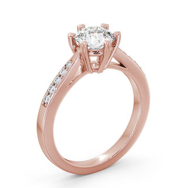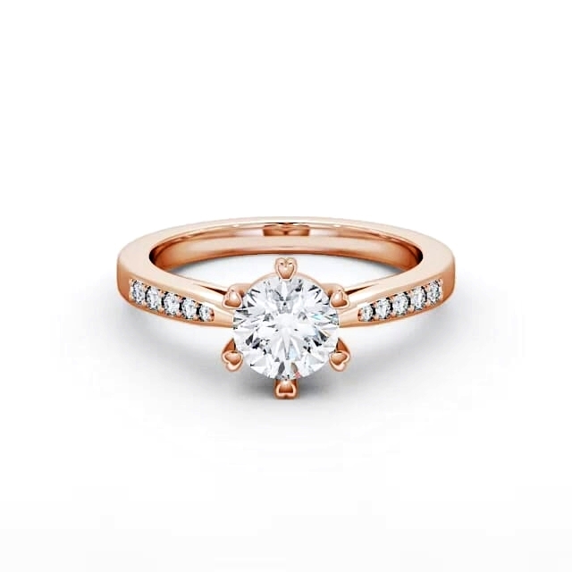 Cosette diamond engagement ring with a six claw 9K Rose Gold setting. Captivating from every angle, this engagement ring showcases a round diamond in the centre protected with six prong setting. Each side of the shoulder is lined with graduated round diamonds. Total diamond side stones weigh approximately 0.08ct with Clarity VS1 and Colour F. This ring is available in a range of metal options and your choice of natural or lab grown diamonds. We offer a free design service for any customised changes that you may require.