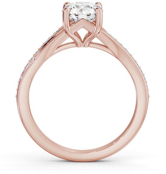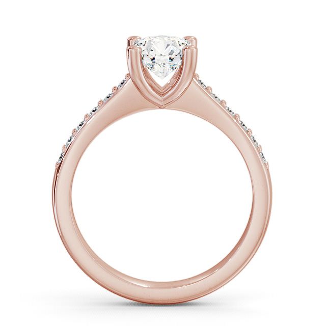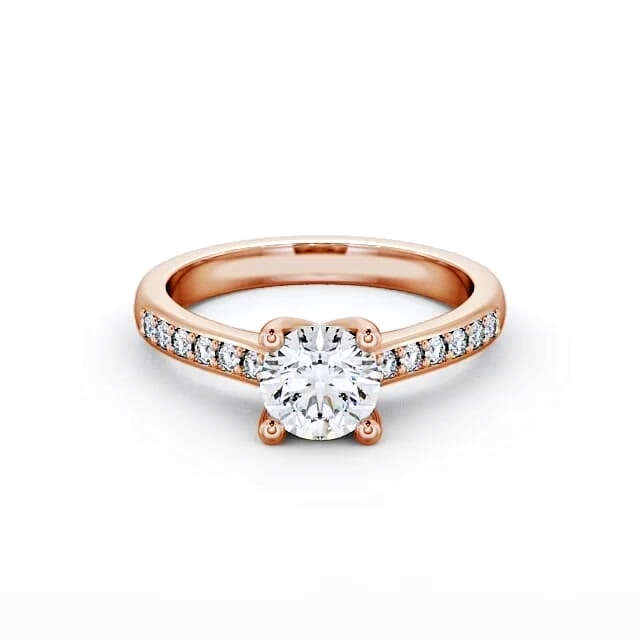 Silvia diamond engagement ring with a four claw 9K Rose Gold setting. Elegant and classic, this engagement ring exhibits a sparkling round diamond in the centre enhanced with small round diamonds embedded shoulders. Total diamond side stones weigh approximately 0.18ct with Clarity VS1 and Colour F. This ring is available in a range of metal options and your choice of natural or lab grown diamonds. We offer a free design service for any customised changes that you may require.