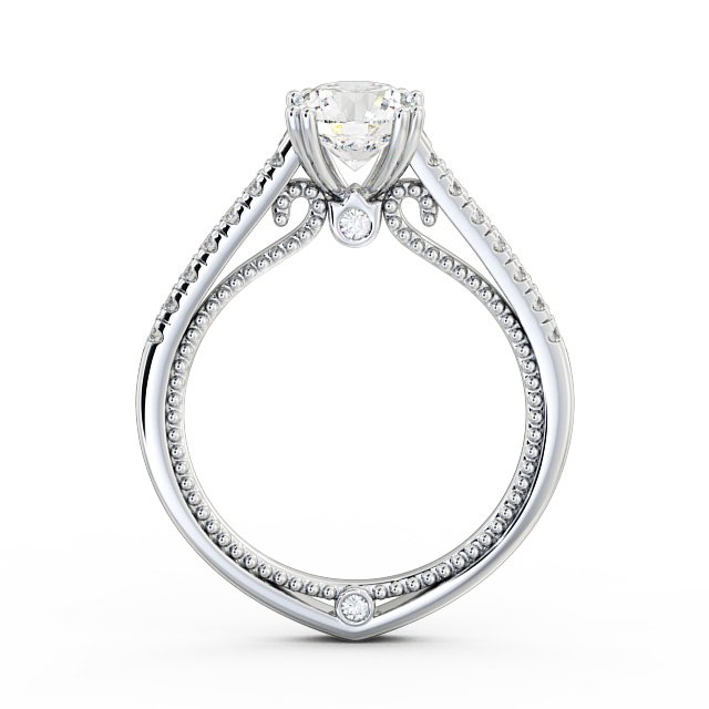 Shanice diamond engagement ring with an eight claw 9K White Gold setting. Simply breathtaking, this engagement ring features a beautiful round diamond in the centre with additional smaller shoulder diamonds. Beautiful milgrain detailed scroll pattern and bezel set round diamonds under the head. The diamond side stones are an approximate total of 0.20ct with Clarity VS1 and Colour F. This ring is available in a range of metal options and your choice of natural or lab grown diamonds. We offer a free design service for any customised changes that you may require.