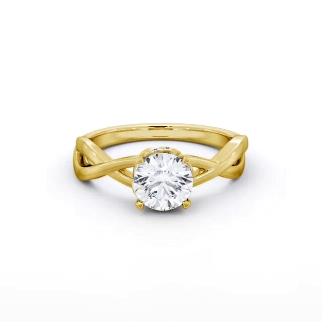 Maisey diamond engagement ring with a four claw 9K Yellow Gold setting. This ultra chic ring exudes sparkling aura with a round shaped centre diamond, and small round diamond accented patterns around the rail. The criss-cross shank shines with polished finish. Total diamond side stones weigh approximately 0.05ct with Clarity VS1 and Colour F. This ring is available in a range of metal options and your choice of natural or lab grown diamonds. We offer a free design service for any customised changes that you may require.