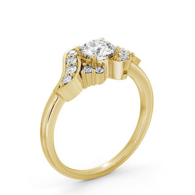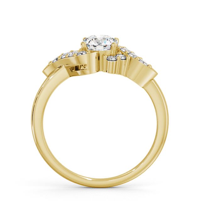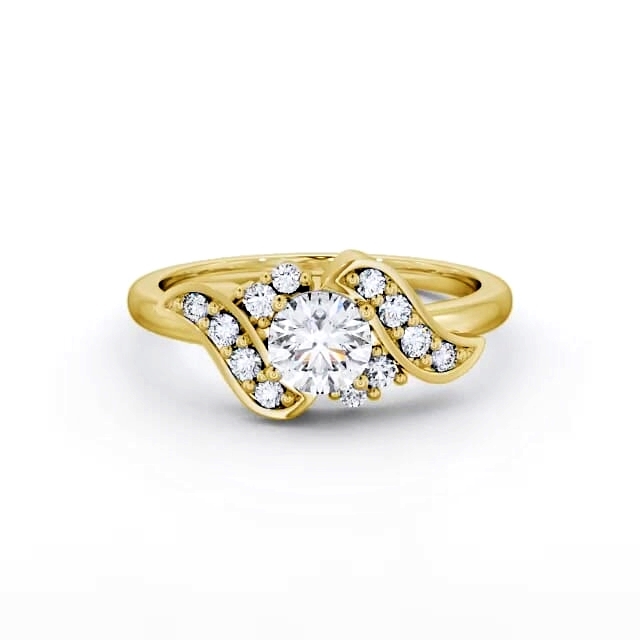 Marly diamond engagement ring with a four claw 9K Yellow Gold setting. Chic and stylish, this exquisite engagement ring features a round-shaped diamond centre accompanied by smaller diamonds set unique swirl design. Smaller diamonds will be of standard quality VS1 Clarity and F Colour. With a mid band width of 2.1mm, this ring is available in a range of metal options and your choice of natural or lab grown diamonds. We offer a free design service for any customised changes that you may require.