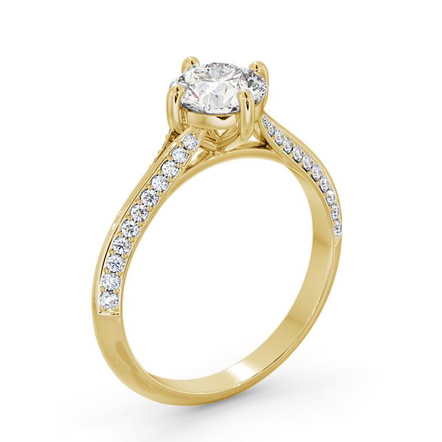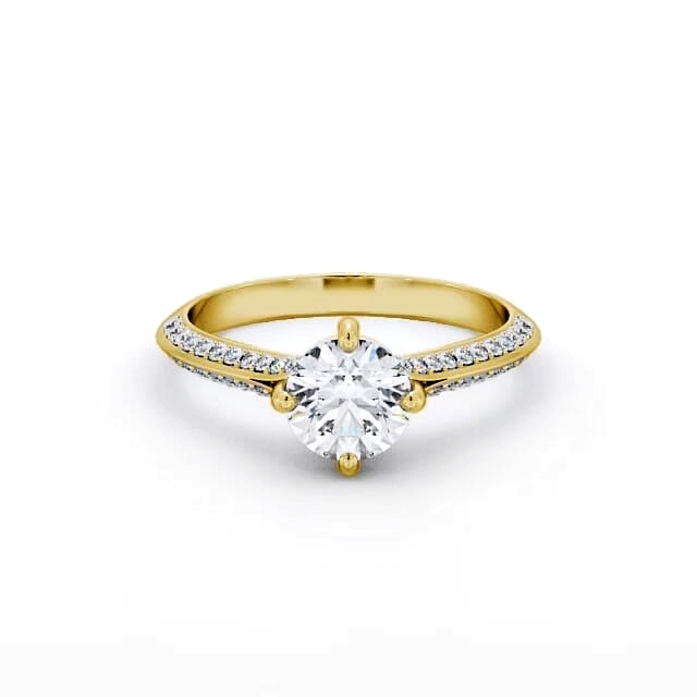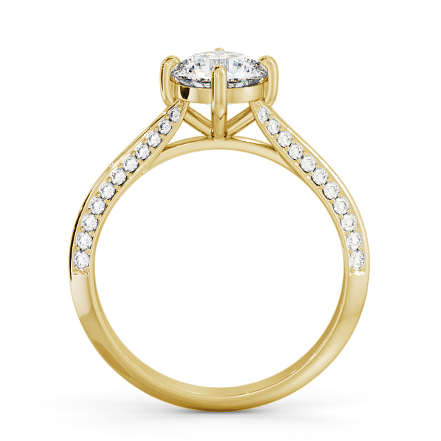 Jacelyn diamond engagement ring with a four claw 9K Yellow Gold setting. Timeless and chic, this engagement ring boasts a single round diamond in the centre whilst additional round diamonds decorates the shoulders. Total diamond side stones weigh approximately 0.24ct with Clarity VS1 and Colour F. This ring is available in a range of metal options and your choice of natural or lab grown diamonds. We offer a free design service for any customised changes that you may require.