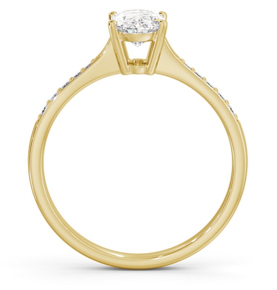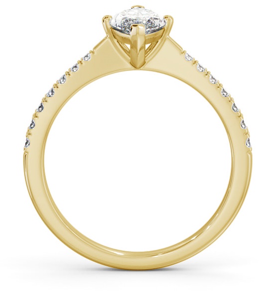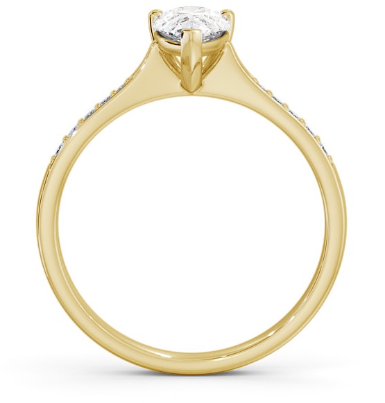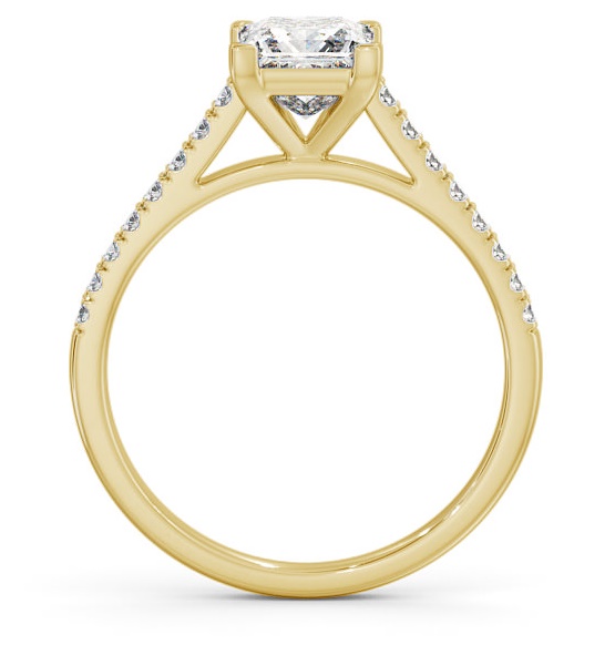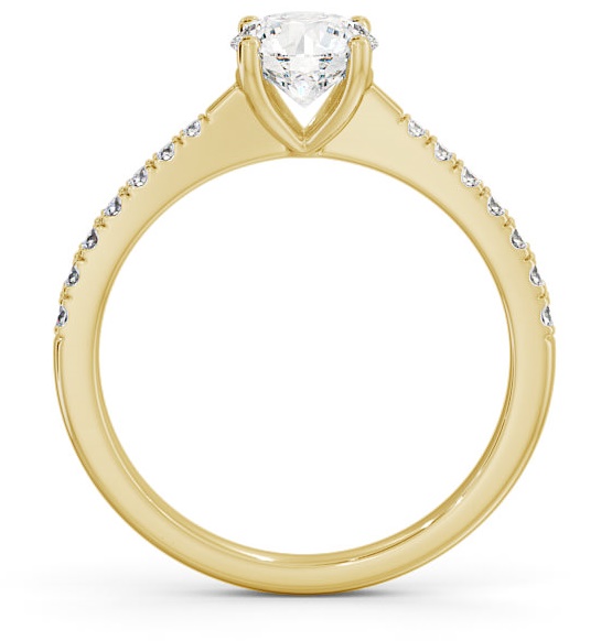 Jasmin diamond engagement ring with a four claw 9K Yellow Gold setting. Sophisticated and enduring, this engagement ring showcases a high set round centre diamond elevated by diamond-lined tapered shoulders. Total diamond side stones weigh approximately 0.12ct with Clarity VS1 and Colour F. This ring is available in a range of metal options and your choice of natural or lab grown diamonds. We offer a free design service for any customised changes that you may require.