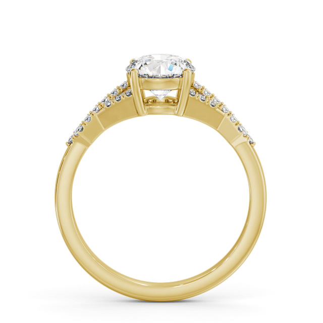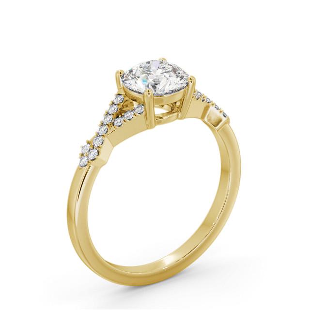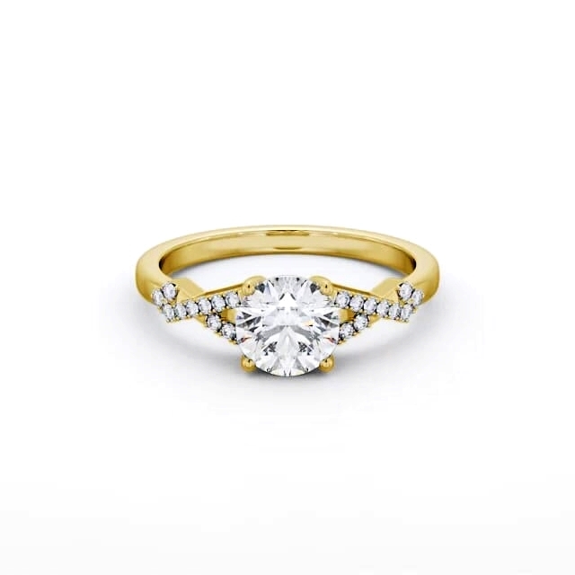 Jaylee diamond engagement ring with a four claw 9K Yellow Gold setting. Subtle and sumptuous engagement ring, a round shaped centre diamond is mounted over small round diamond studded split design shoulders. Total diamond side stones weigh approximately 0.14ct with Clarity VS1 and Colour F. This ring is available in a range of metal options and your choice of natural or lab grown diamonds. We offer a free design service for any customised changes that you may require.