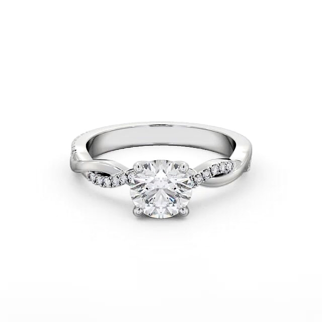 Ellen diamond engagement ring with a four claw Platinum setting. A round shaped diamond sits at the centre of this superlative engagement ring. Small round diamond lined ribbon is artfully woven with a polished finish plain ribbon on each side of the band. Total diamond side stones weigh approximately 0.18ct with Clarity VS1 and Colour F. This ring is available in a range of metal options and your choice of natural or lab grown diamonds. We offer a free design service for any customised changes that you may require.