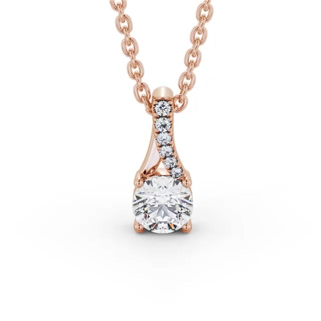 Alaina solitaire stud diamond pendant in 9K Rose Gold. This graceful pendant gleams with a large round shaped diamond in a four prong setting along with a small round diamond accented twisted bail. This pendant is available in a range of metal and chain options with your choice of natural or lab grown diamonds. We offer a free design service for any customised changes that you may require.
