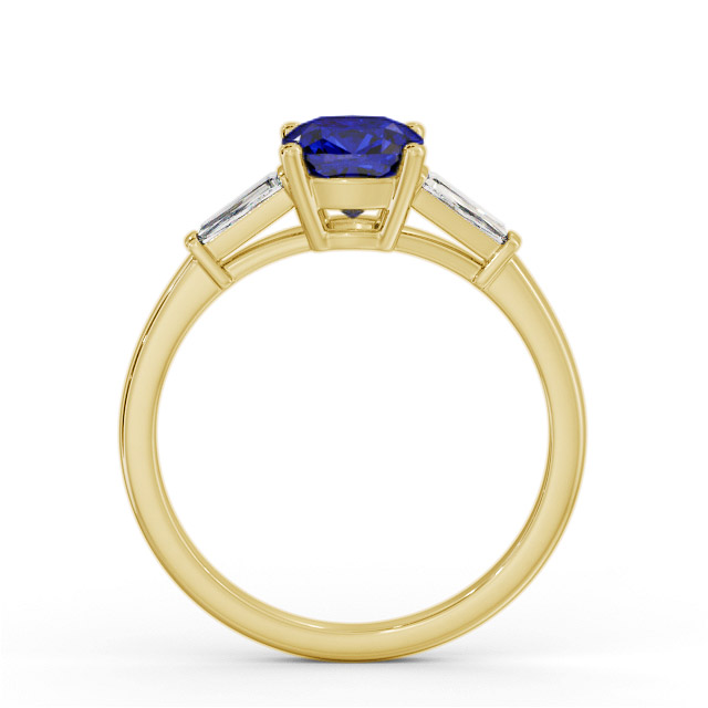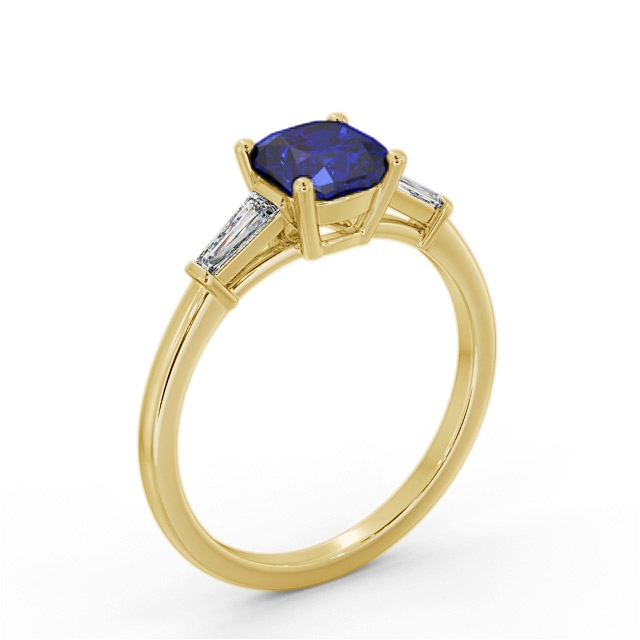 Adelia shoulder stone blue sapphire and diamond 1.60ct ring in 18K Yellow Gold. A modern, sleek ring with a 0.30 carat total weight of tapering baguette shaped diamonds either side of a 0.85 carat cushion shaped blue sapphire in the centre. This ring is available in a variety of metal types and your choice of natural or lab grown gems. We provide a free design service for any special modifications that you may require.