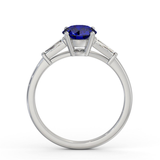 Chiara shoulder stone blue sapphire and diamond 1.70ct ring in Palladium. A lovely and regal design with a 1.40 carat round blue sapphire in the centre, and 0.30 total carat of tapering baguette shaped diamonds on either side. This ring is available in a variety of metal types and your choice of natural or lab grown gems. We provide a free design service for any special modifications that you may require.