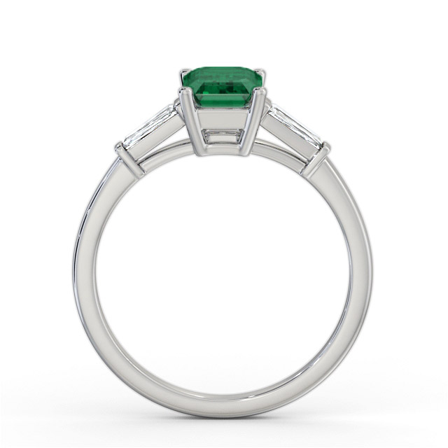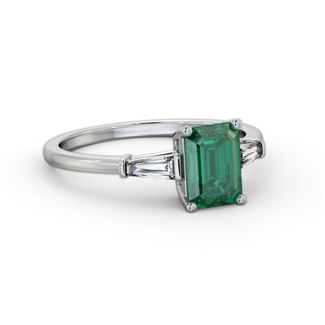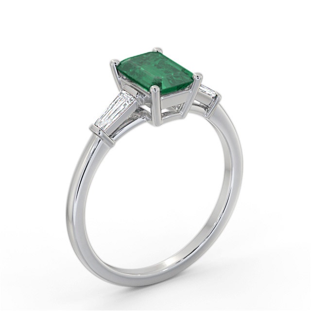 Raven shoulder stone emerald and diamond 1.20ct ring in Platinum. An elegant and modern ring with an emerald shaped emerald weighing 0.90 carat as its focal point and tapering baguette shaped diamonds totaling 0.30 carat on either side. This ring is available in a variety of metal types and your choice of natural or lab grown gems. We provide a free design service for any special modifications that you may require.