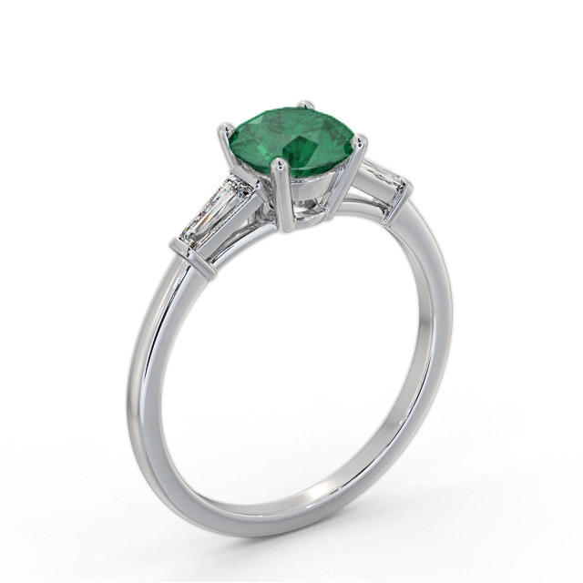 Chiara shoulder stone emerald and diamond 1.55ct ring in Platinum. A lovely and regal design with a 1.25 carat round emerald in the centre, and 0.30 total carat of tapering baguette shaped diamonds on either side. This ring is available in a variety of metal types and your choice of natural or lab grown gems. We provide a free design service for any special modifications that you may require.