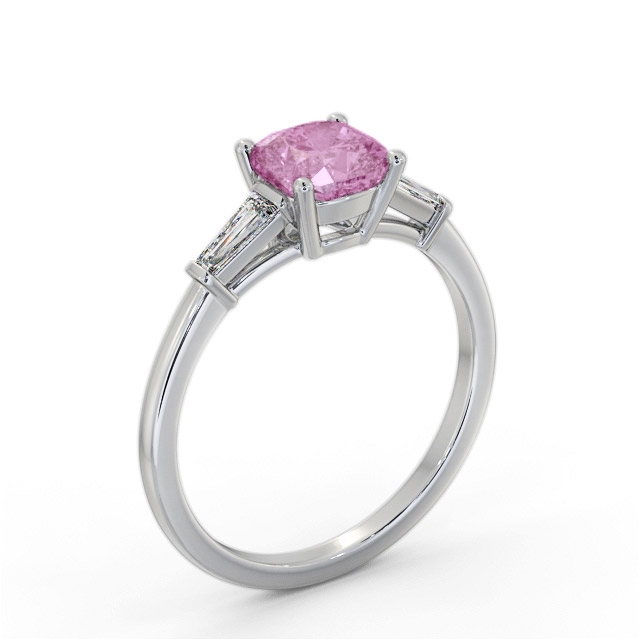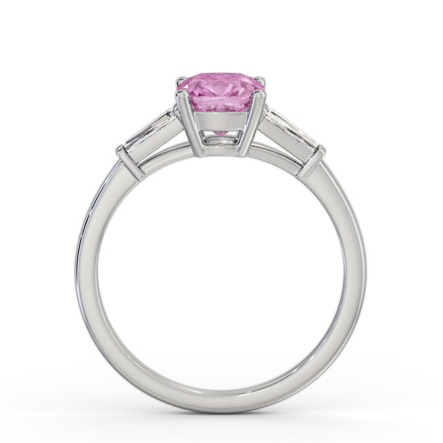 Adelia shoulder stone pink sapphire and diamond 1.60ct ring in 9K White Gold. A modern, sleek ring with a 0.30 carat total weight of tapering baguette shaped diamonds either side of a 0.85 carat cushion shaped pink sapphire in the centre. This ring is available in a variety of metal types and your choice of natural or lab grown gems. We provide a free design service for any special modifications that you may require.