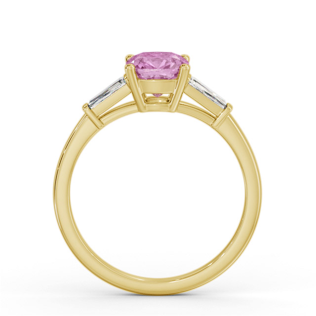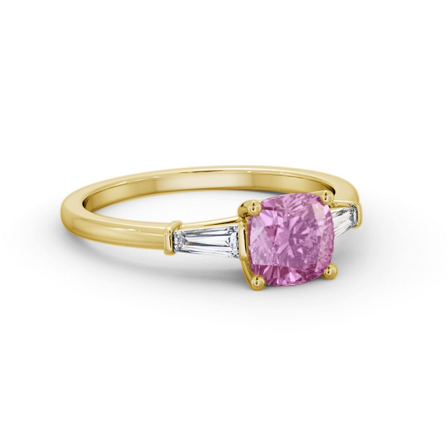 Adelia shoulder stone pink sapphire and diamond 1.60ct ring in 9K Yellow Gold. A modern, sleek ring with a 0.30 carat total weight of tapering baguette shaped diamonds either side of a 0.85 carat cushion shaped pink sapphire in the centre. This ring is available in a variety of metal types and your choice of natural or lab grown gems. We provide a free design service for any special modifications that you may require.