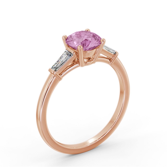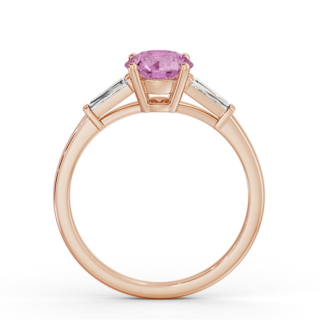 Chiara shoulder stone pink sapphire and diamond 1.70ct ring in 9K Rose Gold. A lovely and regal design with a 1.40 carat round pink sapphire in the centre, and 0.30 total carat of tapering baguette shaped diamonds on either side. This ring is available in a variety of metal types and your choice of natural or lab grown gems. We provide a free design service for any special modifications that you may require.