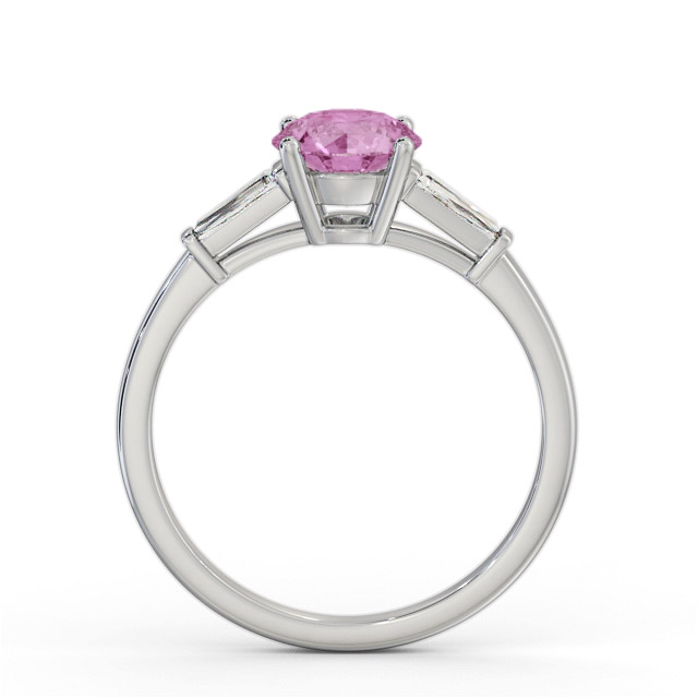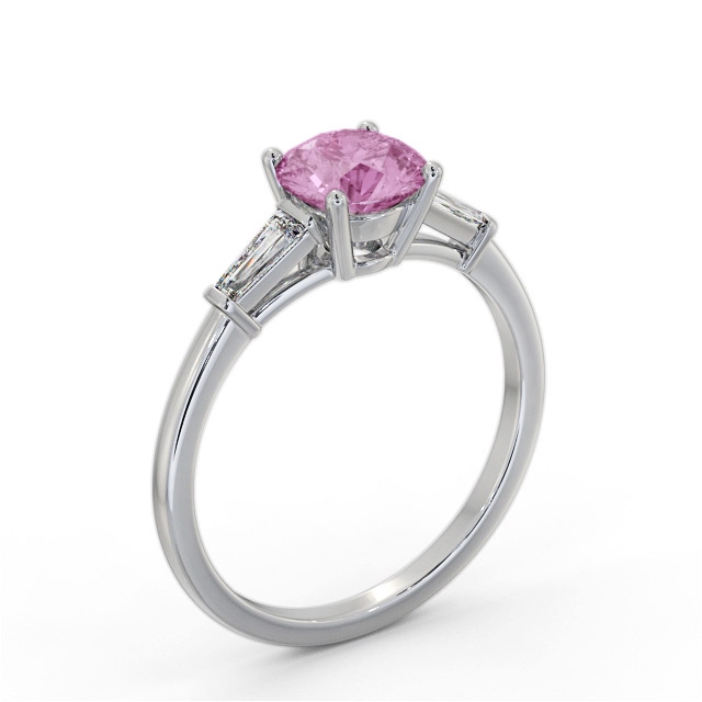 Chiara shoulder stone pink sapphire and diamond 1.70ct ring in Palladium. A lovely and regal design with a 1.40 carat round pink sapphire in the centre, and 0.30 total carat of tapering baguette shaped diamonds on either side. This ring is available in a variety of metal types and your choice of natural or lab grown gems. We provide a free design service for any special modifications that you may require.