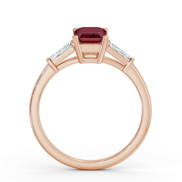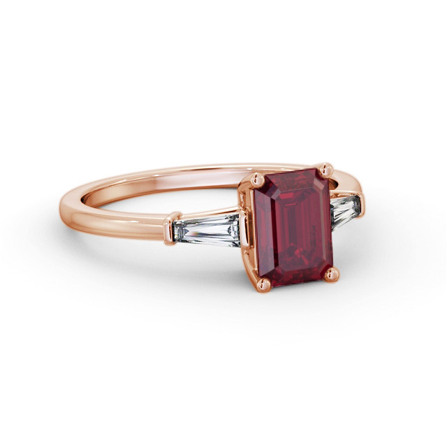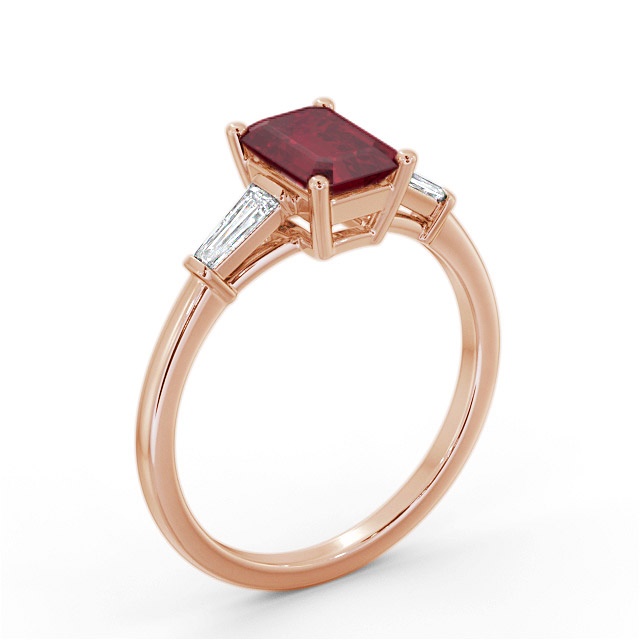 Raven shoulder stone ruby and diamond 1.45ct ring in 18K Rose Gold. An elegant and modern ring with an emerald shaped ruby weighing 1.15 carat as its focal point and tapering baguette shaped diamonds totaling 0.30 carat on either side. This ring is available in a variety of metal types and your choice of natural or lab grown gems. We provide a free design service for any special modifications that you may require.