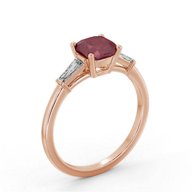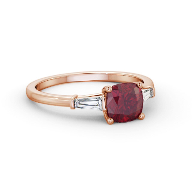 Adelia shoulder stone ruby and diamond 1.60ct ring in 9K Rose Gold. A modern, sleek ring with a 0.30 carat total weight of tapering baguette shaped diamonds either side of a 0.85 carat cushion shaped ruby in the centre. This ring is available in a variety of metal types and your choice of natural or lab grown gems. We provide a free design service for any special modifications that you may require.