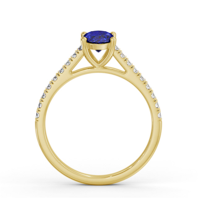 Brianda solitaire blue sapphire and diamond 1.20ct ring in 18K Yellow Gold. Ring with a single 1.00ct Oval shaped blue sapphire and a line of small Oval shaped diamonds along either side of the band totaling 0.20ct in diamond weight. This ring is available in a variety of metal types and your choice of natural or lab grown gems. We provide a free design service for any special modifications that you may require.