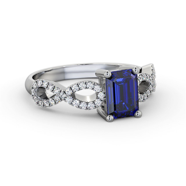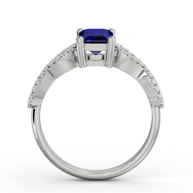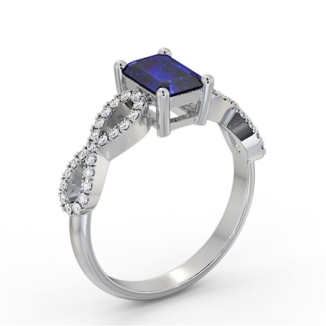 Nava solitaire blue sapphire and diamond 1.45ct ring in 9K White Gold. Stunning and modern design ring with a single 1.15ct Emerald shaped blue sapphire with a crossover pattern of small round sized diamonds along either side of the band totaling 0.30ct. This ring is available in a variety of metal types and your choice of natural or lab grown gems. We provide a free design service for any special modifications that you may require.