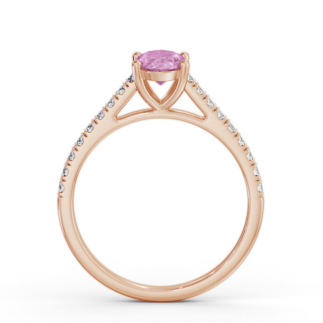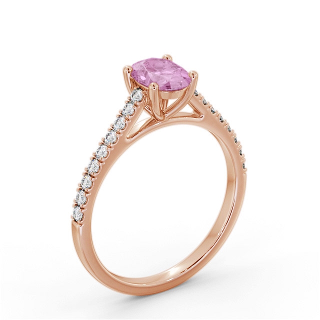 Brianda solitaire pink sapphire and diamond 1.20ct ring in 18K Rose Gold. Ring with a single 1.00ct Oval shaped pink sapphire and a line of small Oval shaped diamonds along either side of the band totaling 0.20ct in diamond weight. This ring is available in a variety of metal types and your choice of natural or lab grown gems. We provide a free design service for any special modifications that you may require.