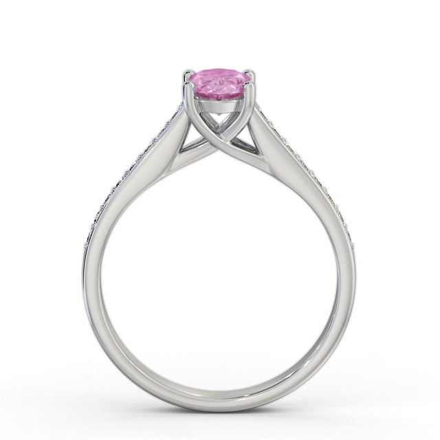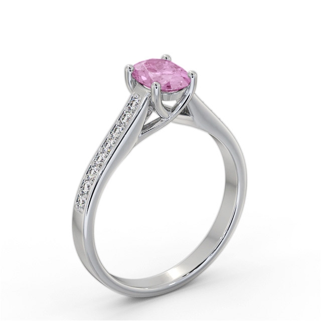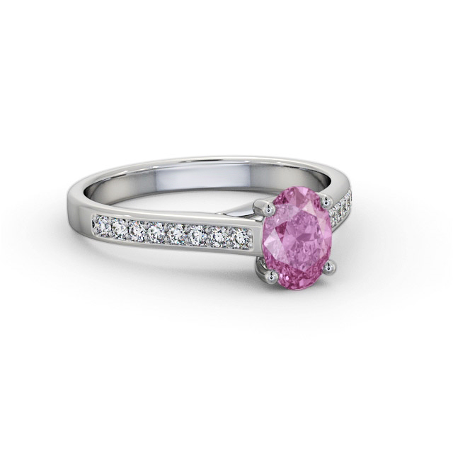 Harben solitaire pink sapphire and diamond 1.15ct ring in 18K White Gold. Ring with a single 1.00ct Oval shaped pink sapphire with a channel of small round shaped diamonds along either side of the band totaling 0.15ct in diamond weight. This ring is available in a variety of metal types and your choice of natural or lab grown gems. We provide a free design service for any special modifications that you may require.