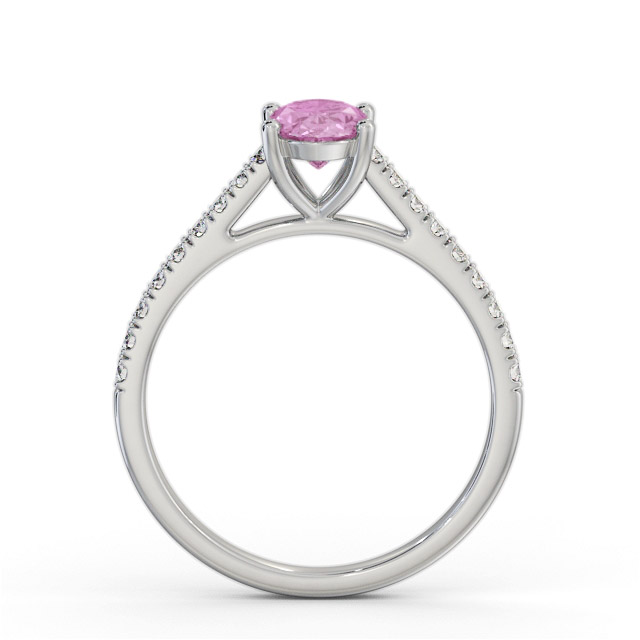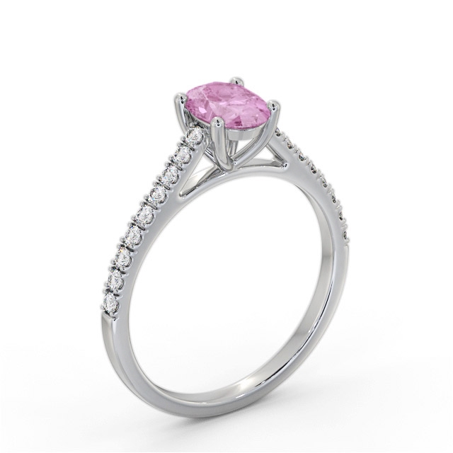 Brianda solitaire pink sapphire and diamond 1.20ct ring in 9K White Gold. Ring with a single 1.00ct Oval shaped pink sapphire and a line of small Oval shaped diamonds along either side of the band totaling 0.20ct in diamond weight. This ring is available in a variety of metal types and your choice of natural or lab grown gems. We provide a free design service for any special modifications that you may require.
