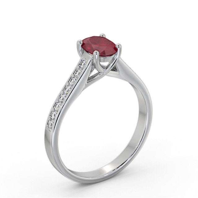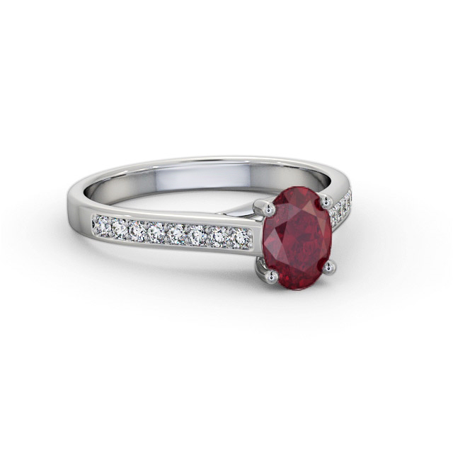 Harben solitaire ruby and diamond 1.15ct ring in 18K White Gold. Ring with a single 1.00ct Oval shaped ruby with a channel of small round shaped diamonds along either side of the band totaling 0.15ct in diamond weight. This ring is available in a variety of metal types and your choice of natural or lab grown gems. We provide a free design service for any special modifications that you may require.