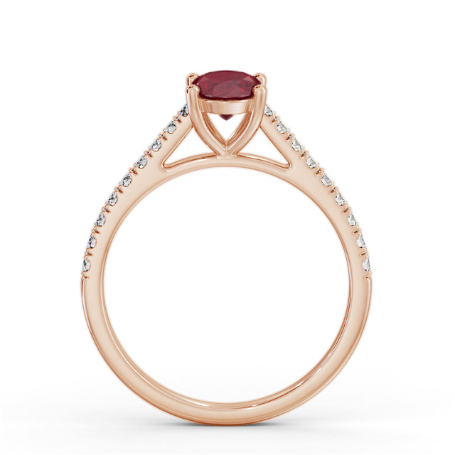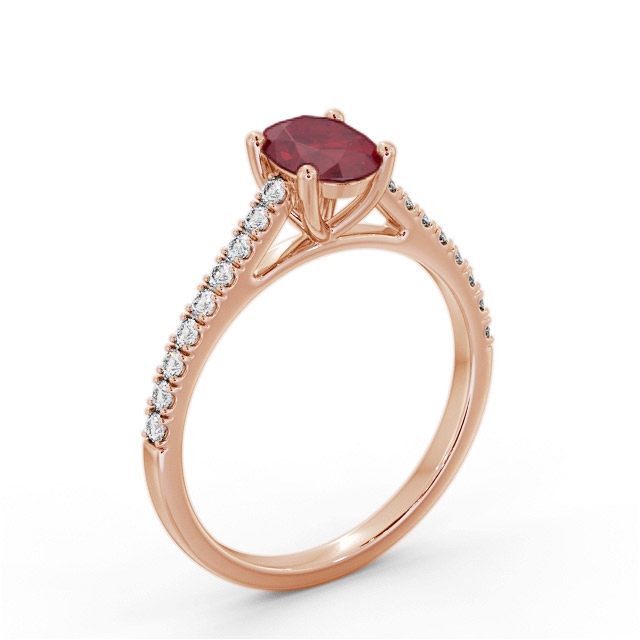 Brianda solitaire ruby and diamond 1.20ct ring in 9K Rose Gold. Ring with a single 1.00ct Oval shaped ruby and a line of small Oval shaped diamonds along either side of the band totaling 0.20ct in diamond weight. This ring is available in a variety of metal types and your choice of natural or lab grown gems. We provide a free design service for any special modifications that you may require.