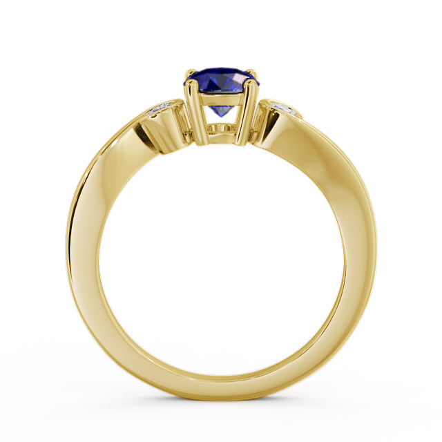 Gracey three stone blue sapphire and diamond 0.75ct ring in a 18K Yellow Gold setting. Truly a modern piece of art, this three stone ring showcases a remarkable single 0.65 Carat round blue sapphire gemstone in the centre flanked by sparkling a round diamond on either side. Total diamonds weighs 0.10 Carat. This ring is available in a range of metal options with AAA grade gemstone. We offer a free design service for any customised changes that you may require.