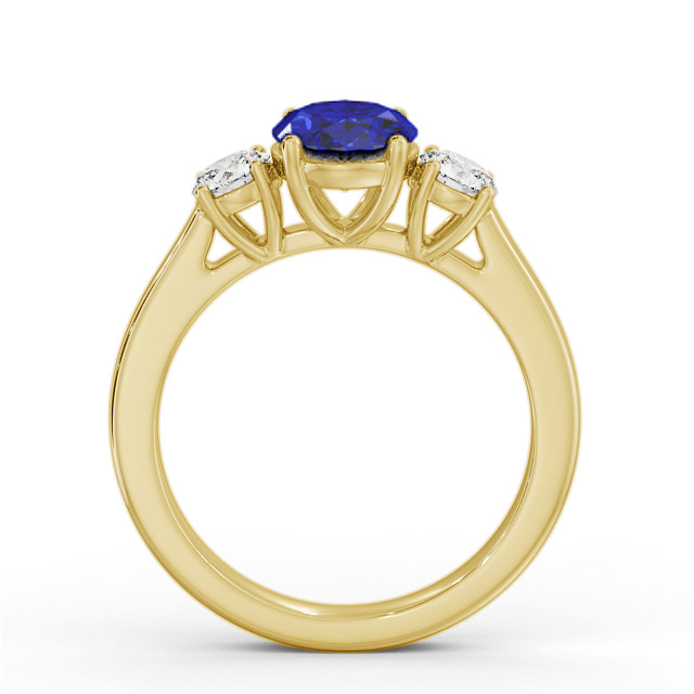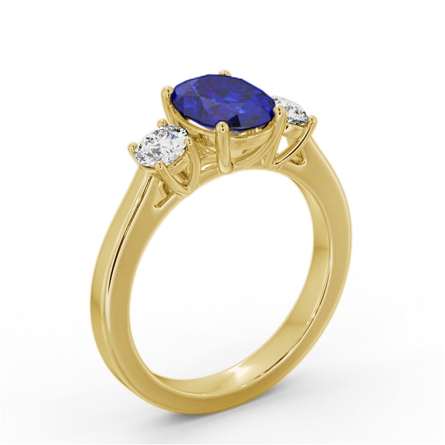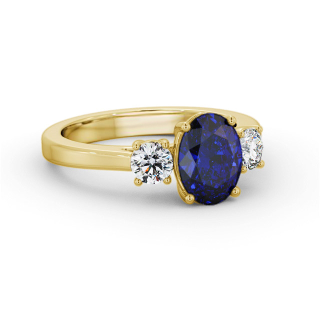 Felicia three stone blue sapphire and diamond 1.95ct ring in 18K Yellow Gold. The 1.55 carat oval blue sapphire in the centre of this classic and beautiful ring is flanked on either side by 0.40 carats of round shaped diamonds. This ring is available in a variety of metal types and your choice of natural or lab grown gems. We provide a free design service for any special modifications that you may require.
