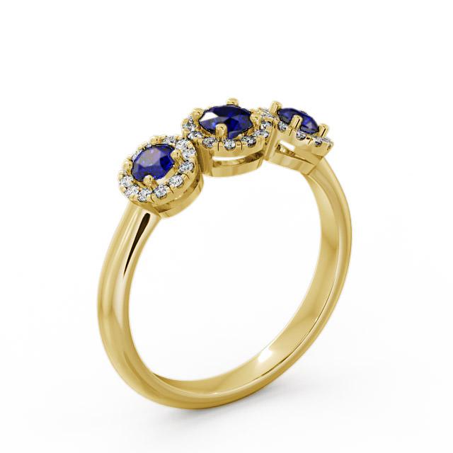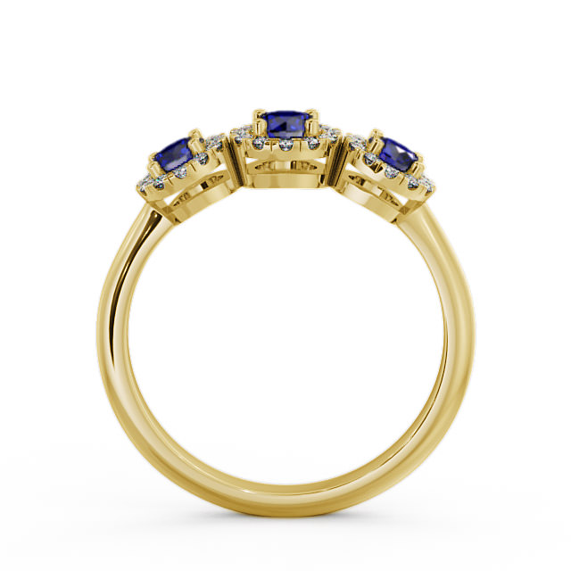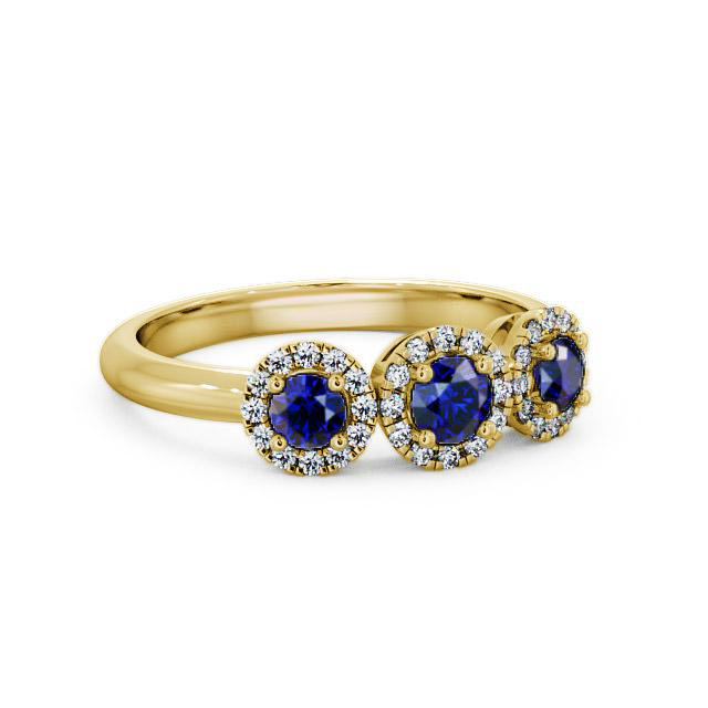 Brianna three stone blue sapphire and diamond 0.64ct ring in a 9K Yellow Gold setting. This vintage-inspired halo ring showcases three round blue sapphire gemstones with total weight of 0.50 Carat, each surrounded by sparkling round diamonds of 0.14 Carat total weight. This ring is available in a range of metal options with AAA grade gemstone. We offer a free design service for any customised changes that you may require.