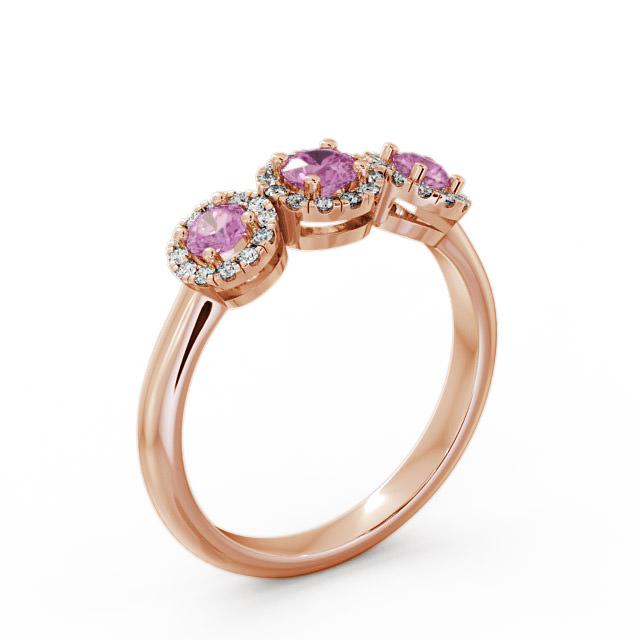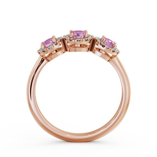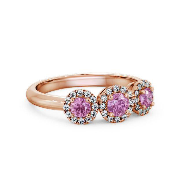 Brianna three stone pink sapphire and diamond 0.64ct ring in a 18K Rose Gold setting. This vintage-inspired halo ring showcases three round pink sapphire gemstones with total weight of 0.50 Carat, each surrounded by sparkling round diamonds of 0.14 Carat total weight. This ring is available in a range of metal options with AAA grade gemstone. We offer a free design service for any customised changes that you may require.