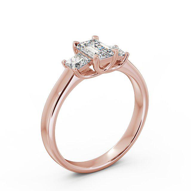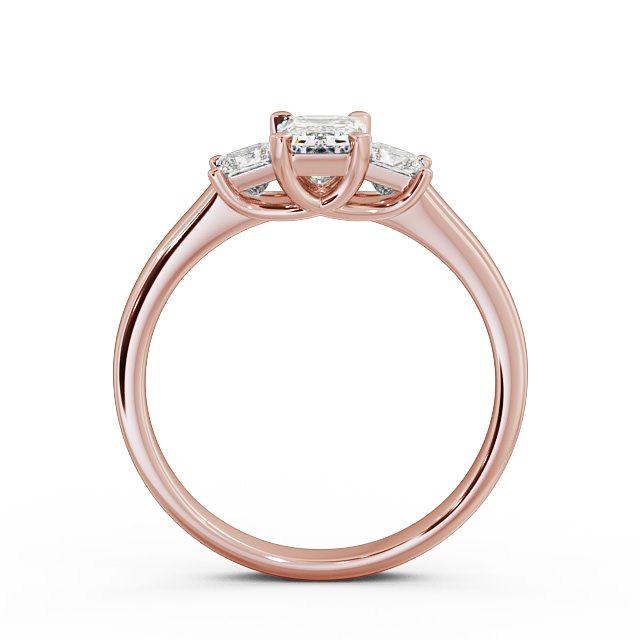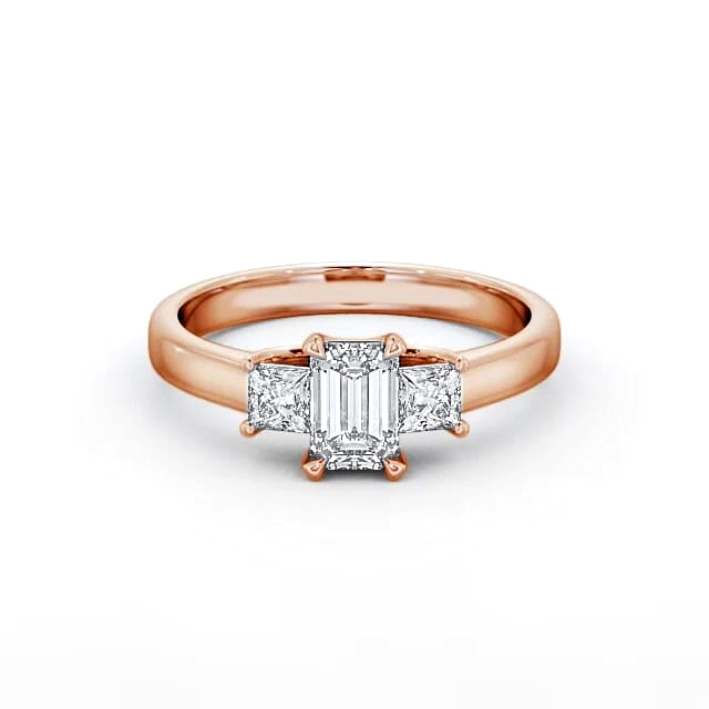 Perel three stone diamond trilogy ring in a 18K Rose Gold setting. Two small princess shaped diamonds guard an emerald-cut centre diamond in this stunning trilogy ring. This ring is available in a range of metal options and your choice of natural or lab grown diamonds. We offer a free design service for any customised changes that you may require.