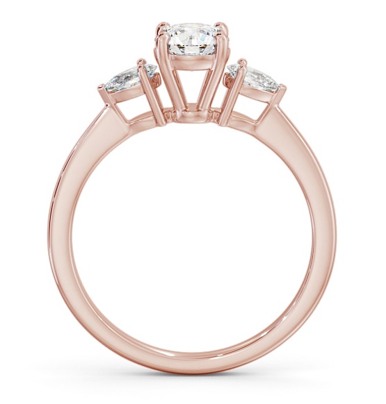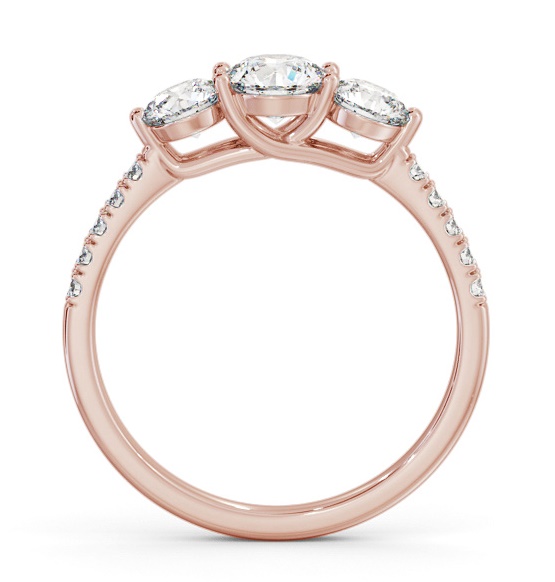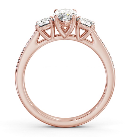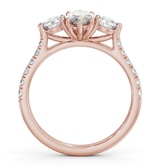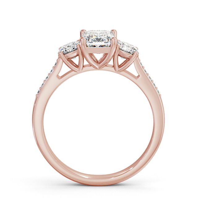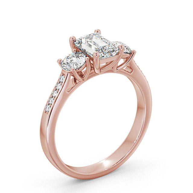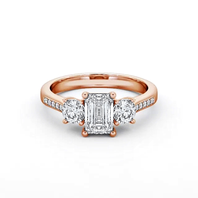 Jolina three stone diamond trilogy ring in a 18K Rose Gold setting. This engagement ring features one emerald shaped diamond accompanied by two round diamonds on either side as a centrepiece. This trilogy ring also has shimmering small round diamonds on both shoulders. Smaller diamonds will be of VS1 Clarity and F Colour as standard. This ring is available in a range of metal options and your choice of natural or lab grown diamonds. We offer a free design service for any customised changes that you may require.