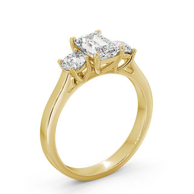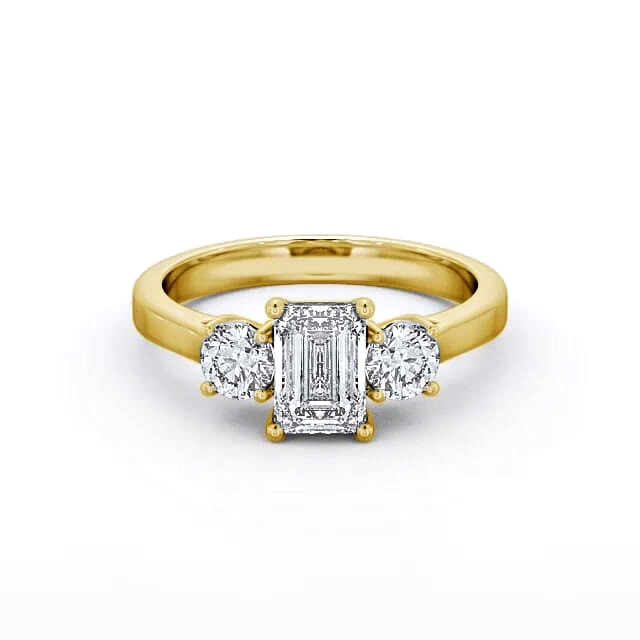 Kourtney three stone diamond trilogy ring in a 18K Yellow Gold setting. Two exquisite small round diamonds flawlessly complements a large emerald shaped centre diamond in this gorgeous trilogy ring. This ring is available in a range of metal options and your choice of natural or lab grown diamonds. We offer a free design service for any customised changes that you may require.