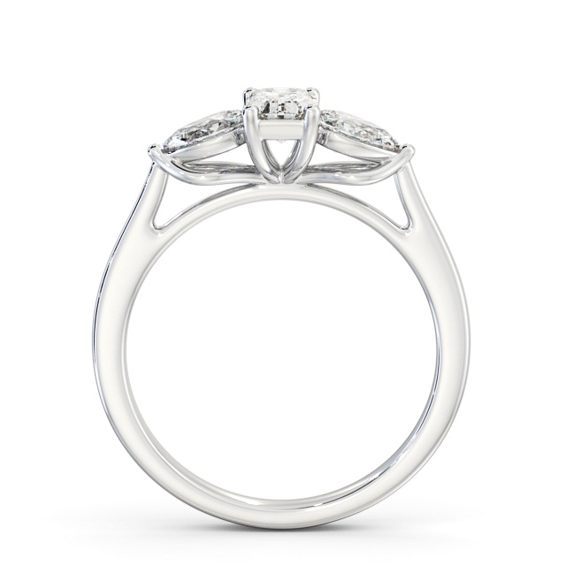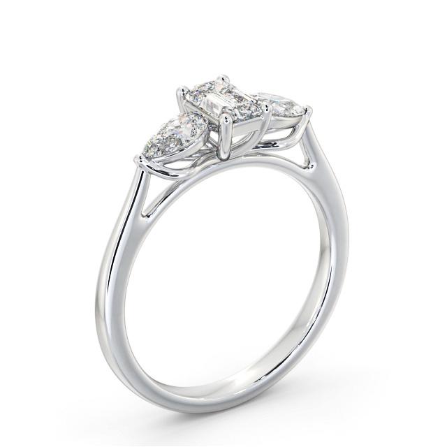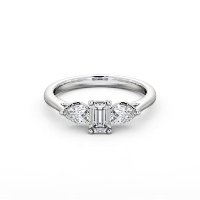 Rafaela three stone diamond trilogy ring in a Platinum setting. An emerald shaped diamond is paired with pear shaped side diamonds in this enchanting ring to grab all the right kind of attention. This ring is available in a range of metal options and your choice of natural or lab grown diamonds. We offer a free design service for any customised changes that you may require.