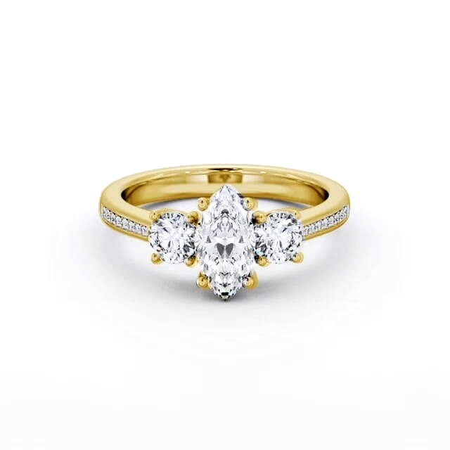 Ophelia three stone diamond trilogy ring in a 18K Yellow Gold setting. With incredible scintillation and an elegant outline, a marquise shaped diamond is complemented by round shaped side diamonds and smaller round diamonds trail down the delicate shoulders. Smaller diamonds will be of VS1 Clarity and F Colour as standard. This ring is available in a range of metal options and your choice of natural or lab grown diamonds. We offer a free design service for any customised changes that you may require.