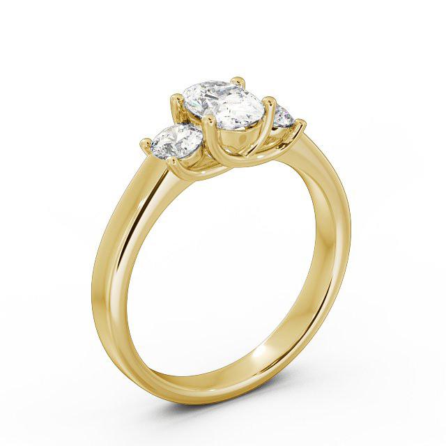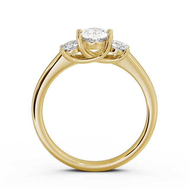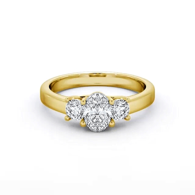 Ainslee three stone diamond trilogy ring in a 18K Yellow Gold setting. Featuring two small round diamonds on either side of the large oval shaped centre diamond, this three stone ring offers extraordinary sparkle. This ring is available in a range of metal options and your choice of natural or lab grown diamonds. We offer a free design service for any customised changes that you may require.